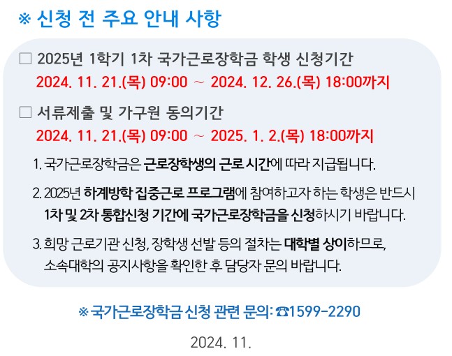 재학생, 신입생, 편입생, 재입학생, 복학생 등 모든 학적 | - 서류 제출 및 가구원 동의: 2024년 11월 21일 ~ 2025년 1월 2일 오후 6시까지 - 신청은 한국장학재단 웹사이트에서 진행 - 가구원 동의는 필수이며, 지원 금액 산정에 필요 |
