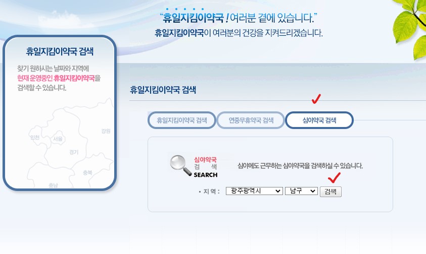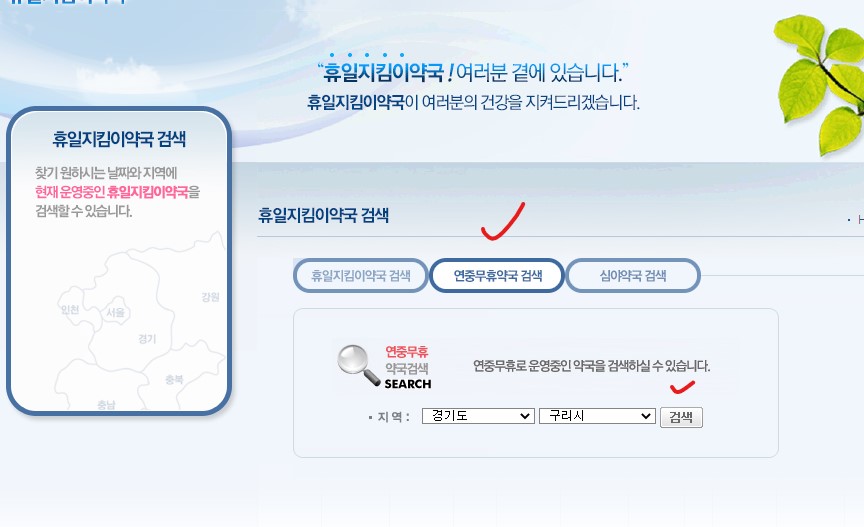 그리고 연중무휴약국도 검색이 따로 되고, 심야약국도 검색이 되니 활용해보시면 도움이 되실 겁니다.