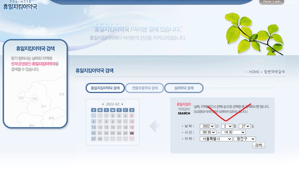 여기 보시면 휴일지킴이 약국 검색, 날짜와 시간 지역을 누루고 검색을 하면 해당 약국이 나오는데요